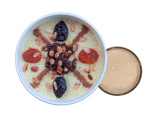 Semoule de blé à la vapeur beurrée, raisins secs et oignons caramélisés, pruneaux, abricots secs, amandes effilées, noix et miel