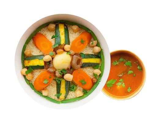 Semoule de blé à la Vapeur, bouillon de légumes frais, raisins secs et oignons caramélisés